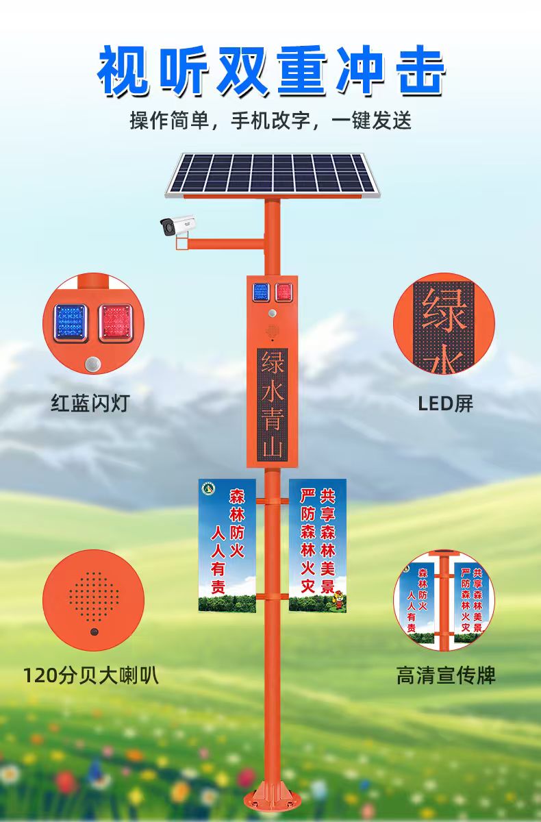 语音系统采用4G功能用手机APP或者电脑软件,根据需要轻松更换语音、LED宣传文字、调节声音,定时播放等功能。随时更新,维护便捷。广告牌可按需求印刷。视频能查看实时画面和之前7天的回放。采用移动侦测模式,检测到有人有车经过才拍照录像,延长内存卡使用。应用于:林区、进山路口、景区